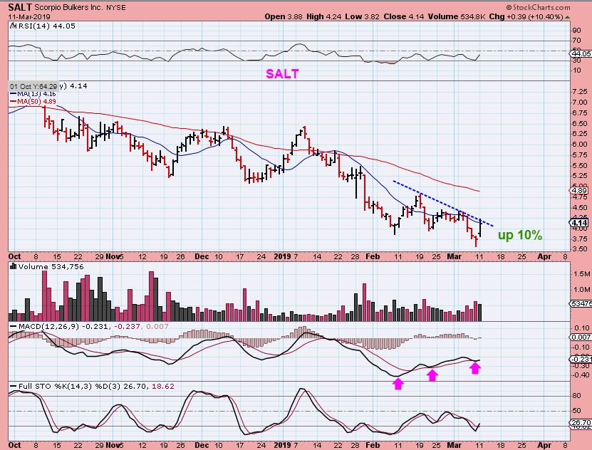 SALT – This small move was a 10% pop, and it could lead to follow through. I would say that it is a buy with a stop at those shake out lows OR wait for a break of the blue line. This may do well, but this isn’t my favorite one…