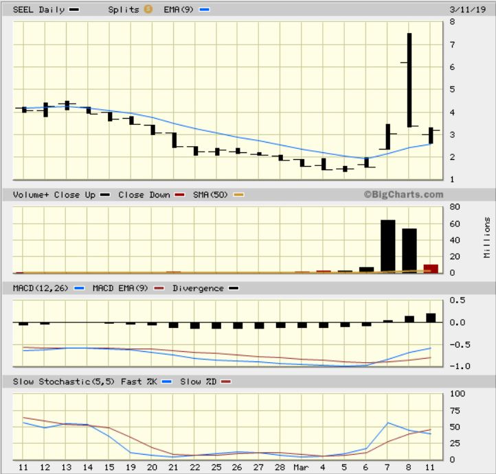SEEL – SEEL RAN FROM $1+ to $7+ in 4 days! It then crashed to the 9 ema and started to reverse. I took a small GAMBLE POSITION under $3 . JUST A VERY SMALL POSITION , a trade/ experiment. Then I captured this chart.
