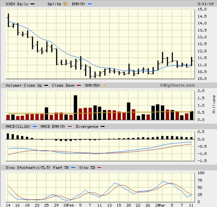 SIEN – This looks ready to break higher soon. This is a base at $10 – $11, but I would buy this here with those volume surges on the upside.
