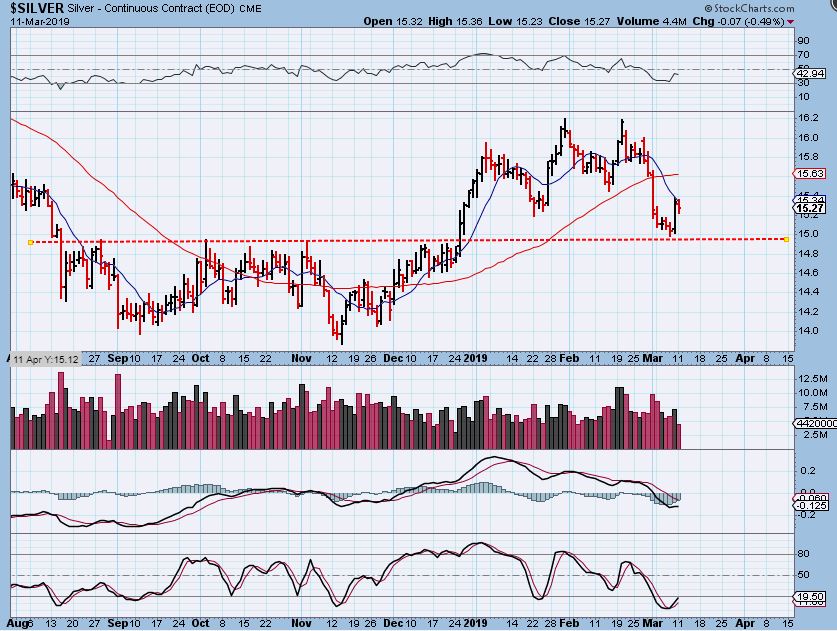 SILVER – Silver was rejected at the 10 sma Monday too. It is also oversold.