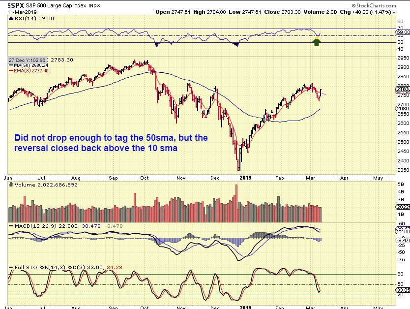 SPX – Monday the SPX closed back above the 10 sma & the RSI curled up from the 50% line. I have to respect that and view it as a possible DCL right there. It would be a buy with a tight stop in that case. I was watching a good number of ‘stocks’, and many DID drop to their 50 sma and reversed, so this may be all of the sell off for now.