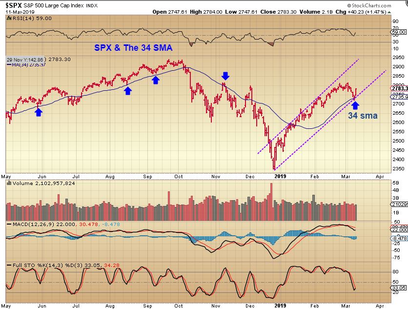 SPX – In the past and in a variety of different markets, I at times will also use the 13 & 34 sma. I find that some of the MJ stocks often follow these, for example, so I decided to look at the SPX with a 34 sma.