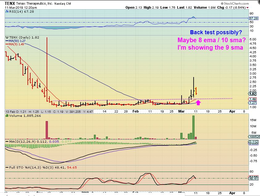 TENX – I love this base. I sold some on the BIG burst higher and have been riding the rest. I was thinking of adding if this pull back to the 8 ema / 10sma and reverses. That could be the next buy point.