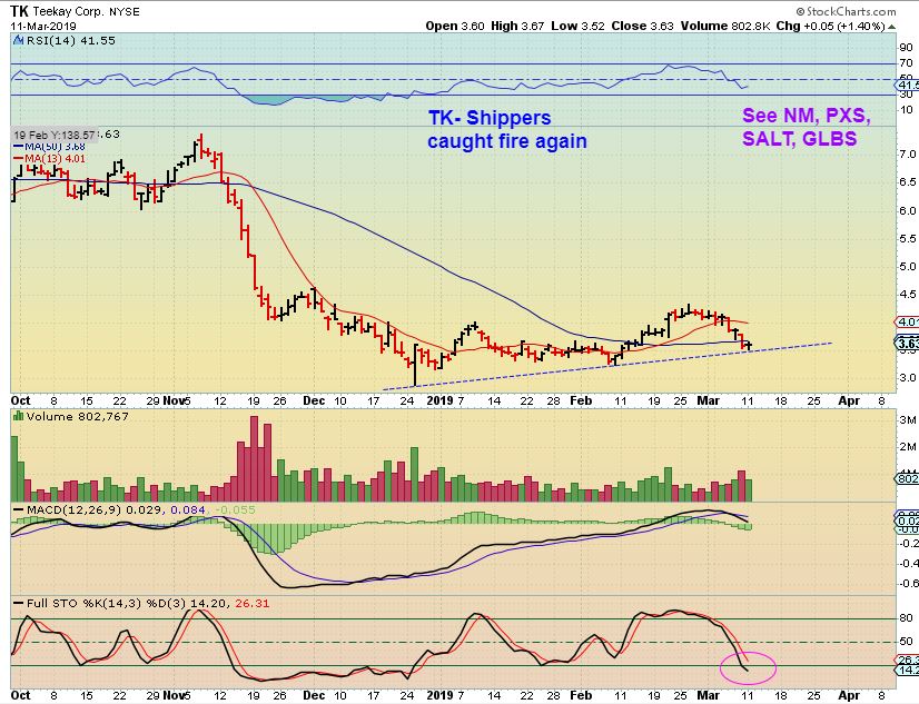 TK – I had this in my reports in feb when it broke the 50sma. TK reversed right at a trend line & 50 sma. If it pushes back above the 50sma Tuesday or Wednesday, that could be a buy too. Shippers run fast, DO NOT just jump into extended ones, unless you know what you are doing as a day trader. It is always best to buy them near support with a stop as they begin to break higher and try to be patient if they go sideways. EXIT if they break down.