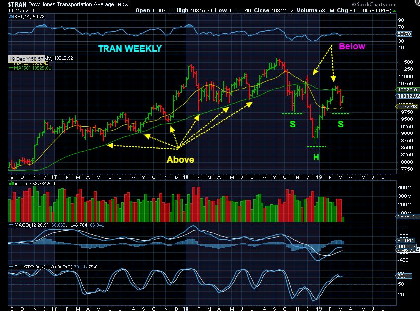 TRAN WEEKLY – The weekly may have formed an inverse H&S. Notice that in the bull run, the TRAN ran along ABOVE of the Green 50 week ma line. Now it is struggling at that line, so let’s see if it can finally regain that 50 week MA or not near $10525.