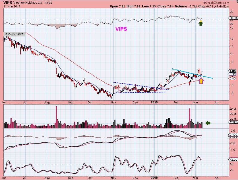 VIPS – Vips was a buy down at $5, and it back tested the 50sma and moved higher again. It is chopping above the 50sma , but still remains bullish in the big picture. It looks ready to run again with Mondays reversal after a break out & back test.