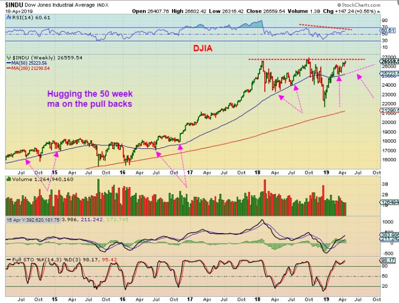 DJIA WEEKLY – After the 2015/2016 sell off, it rallied strongly to prior highs and then dropped to the 50 week ma. As the DJIA hits prior highs, we do see divergence, so be aware of that.