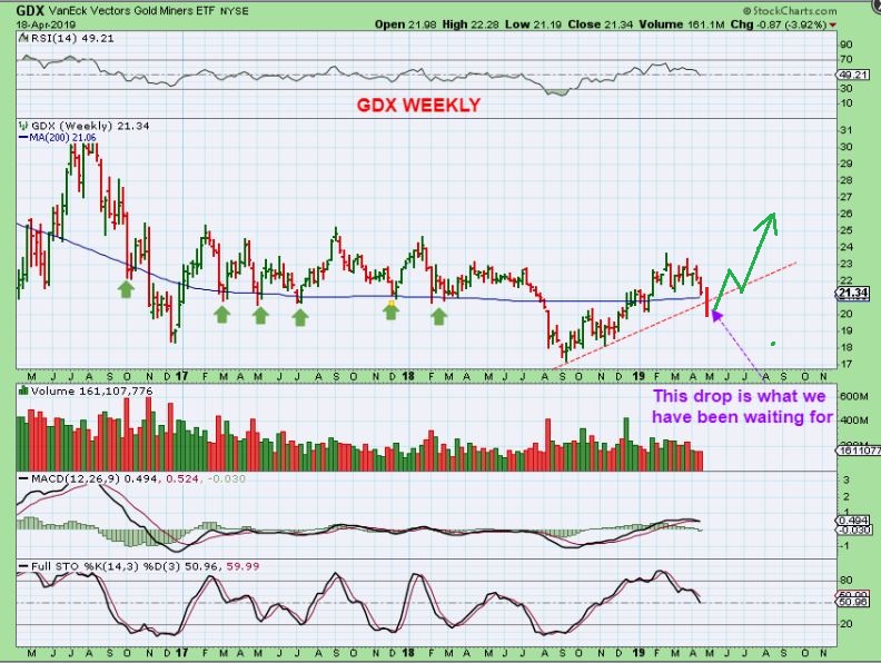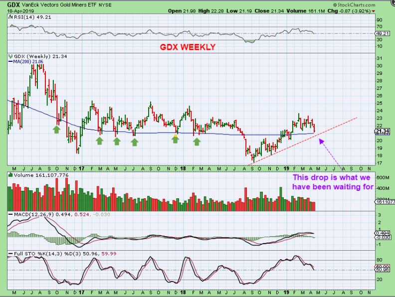 GDX WEEKLY MARCH 28 – No doubt you remember these 2 charts, since I have included them in a few of the past reports. It is hoping that we get that drop to support and look for a reversal to go long.