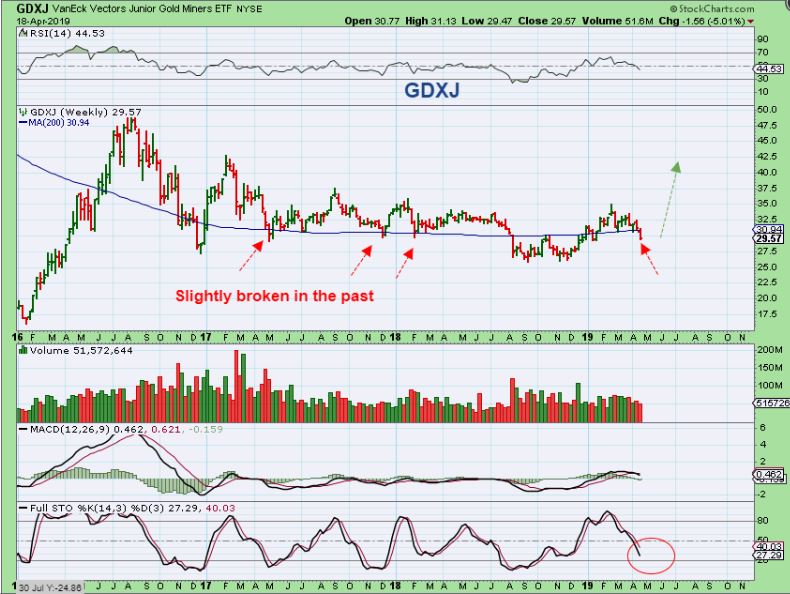 GDXJ WEEKLY – The weekly chart shows that we have reached that price point, so the gap on the daily has filled. Can it drop deeper? Yes, but this already looks similar to the prior breaks below the 200sma, so we’ll keep an eye on it.