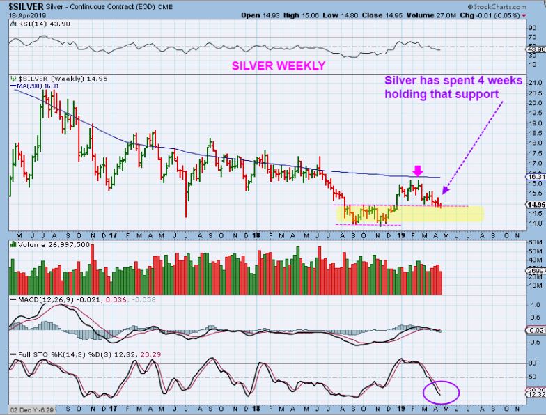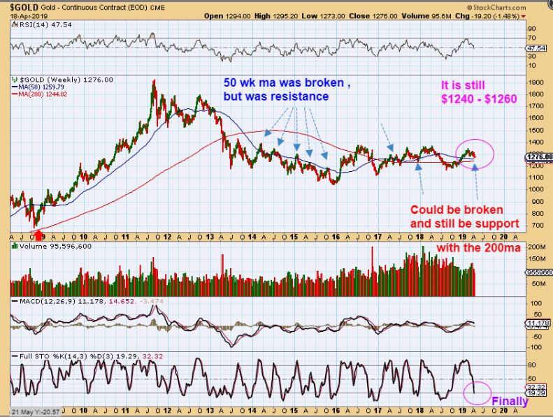 GOLD WEEKLY – For starters, take a look at how Gold has acted at the red 200 week ma and the blue 50 week ma in the past. They are again pinched close to each other, and that gives us the $1240 to $1260 Price range, which was the area that we have been looking at for weeks. So again, on day 30, Golds daily chart shows that we could get a quick slam down next week too, and that may be all the selling we get. It seems too easy, but that is the way this looks at this point. And Silver?…