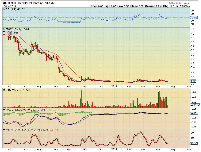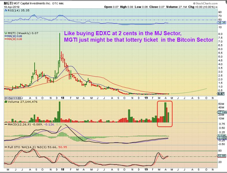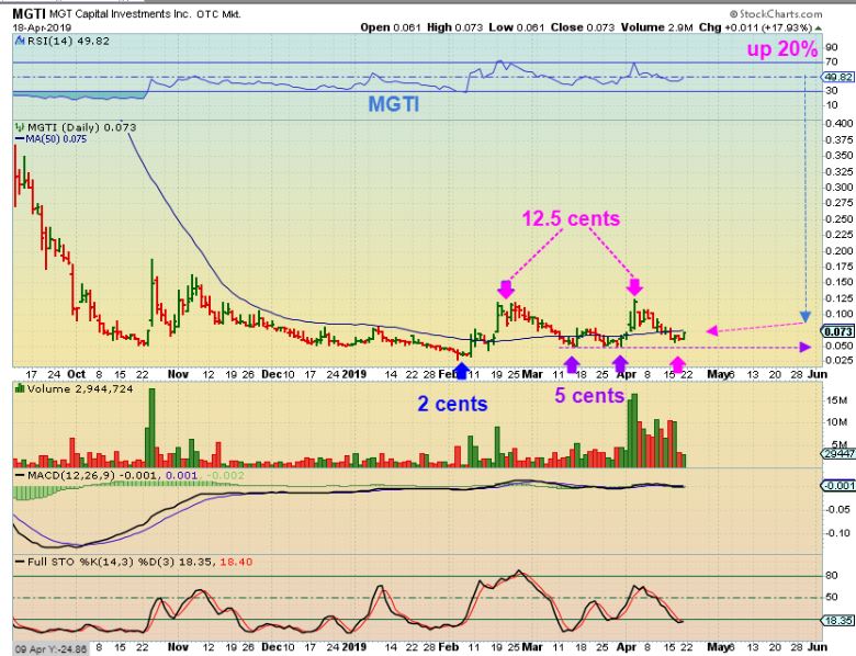 The story behind MGTI is very bullish if Bitcoin continues to rise. I read about them in 2017 & they had a very good set up at that time. It was a bullish story on Bitcoin, and back then I made good money on this company. It then dropped from $8 to $0.02. Wow! So MGTI was a very bullish story when Bitcoin was soaring, and they provided an update on March 20th. I still like what I read a lot, you may want to look it up. They still can make money with Bitcoin around $2000, and they actually Mine Bitcoin. When Bitcoin sold off, they put some Bitcoin Mining operations on hold, until it becomes more profitable to plug them in again, presumably somewhere above $3000. That update article that I read was written when Bitcoin was at my ‘Buy’ of just above $3000. Bitcoin is now holding at $5000 and I still expect $6000. I’m looking forward to the next MGTI update and see if they have taken advantage of the price of Bitcoin almost doubling since the Dec Lows.