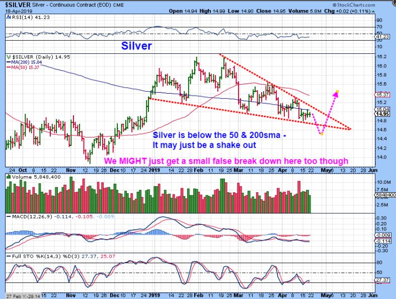 Silver Daily – I have been pointing out a bullish descending wedge. This CAN just break out from here, but a false break down would shake out some bulls, so that may happen too.