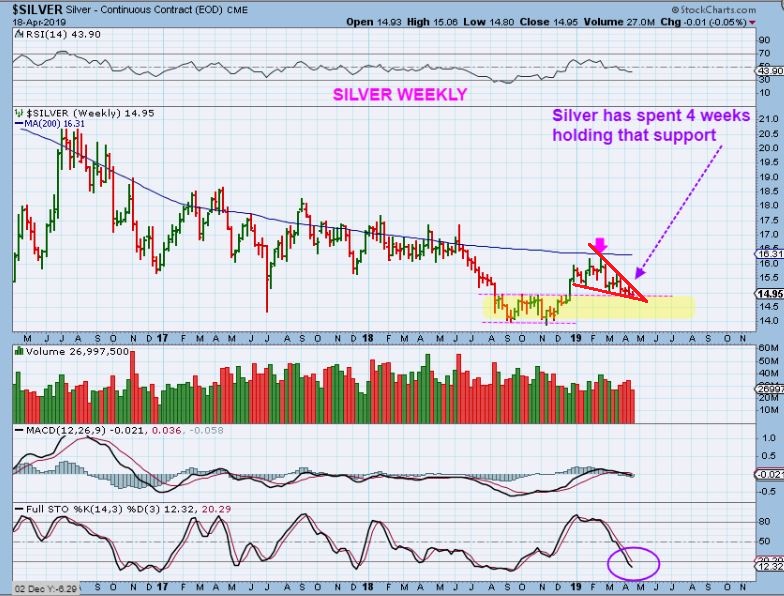 SILVER WEEKLY #1 – Silver has been holding support for many weeks. Silver has a bullish descending wedge that is at support. I think Silver may actually be done selling off, but I’m waiting for some type of reversal to prove it.