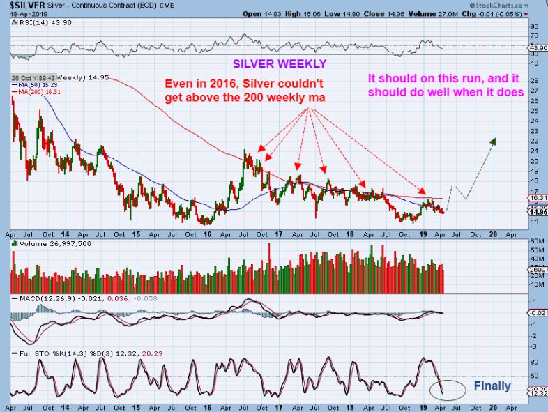 SILVER WEEKLY #2– Do you see how Silver has been capped by that 200 week ma? When it gets above that, it could really take off. I have been saying that you want to own some Silver stocks when Silver breaks higher.