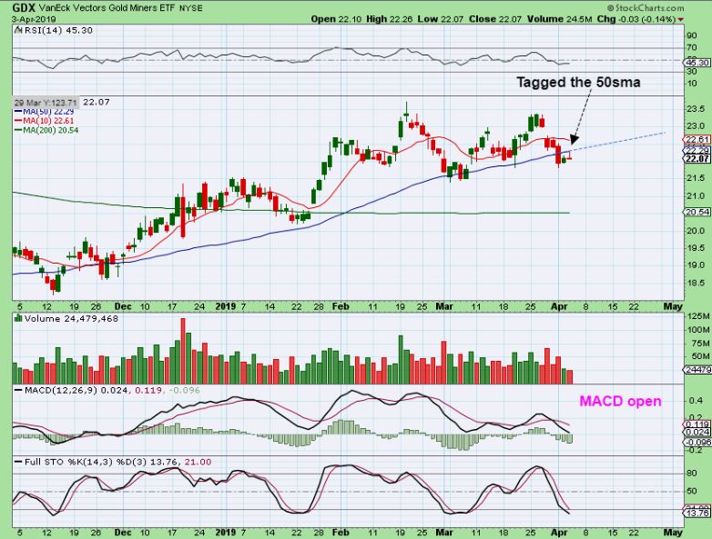 GDX – GDX tagged the 50sma , but it sold off after doing so. It is oversold, but it can remain oversold for a while.