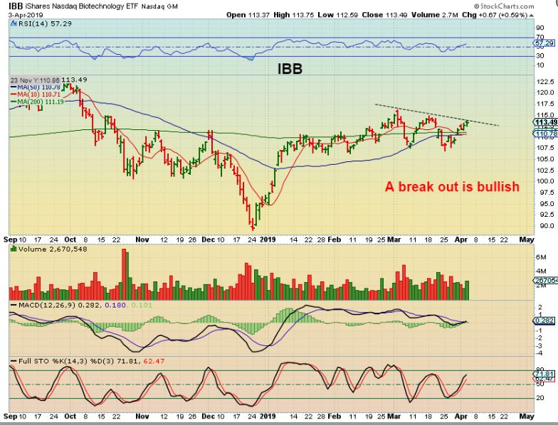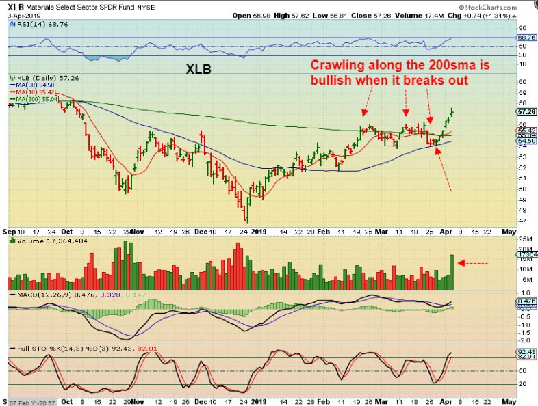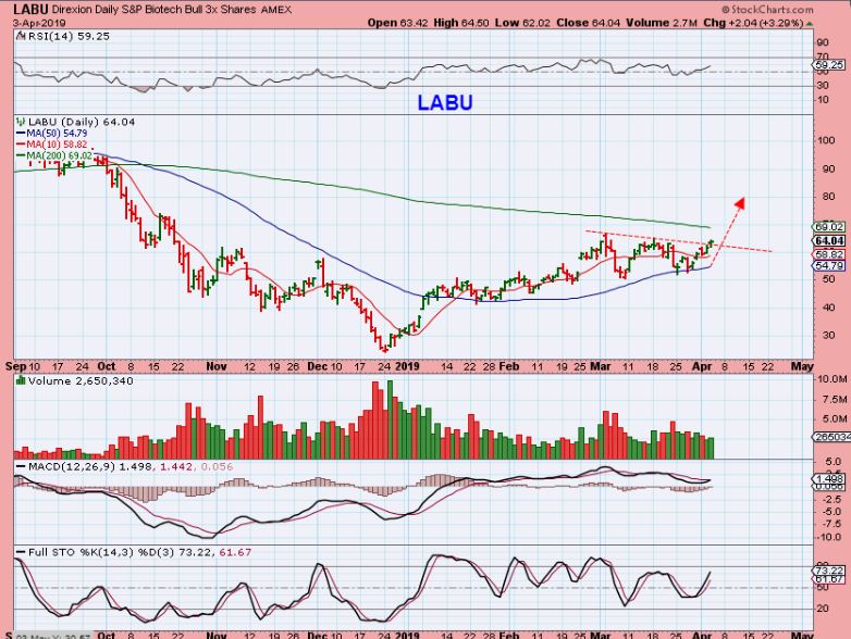 XLB– Look at how long the IBB has been running along the 200sma above, and compare it to the XLB here below. The XLB broke out and a break out from that sideways chop can be very nice. IBB looks set to break out, and LABU…
