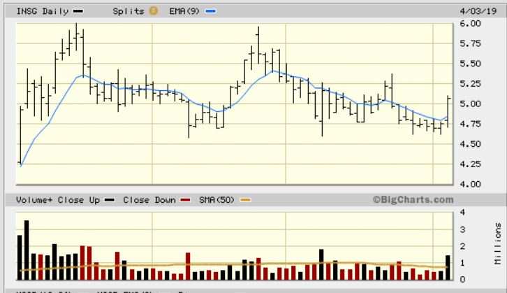 INSG #1 – This is yesterdays pop above the 10sma and you can see the volume increase. I’m pointing out this Tech company because it has other longer term bullish features too. See the next chart…