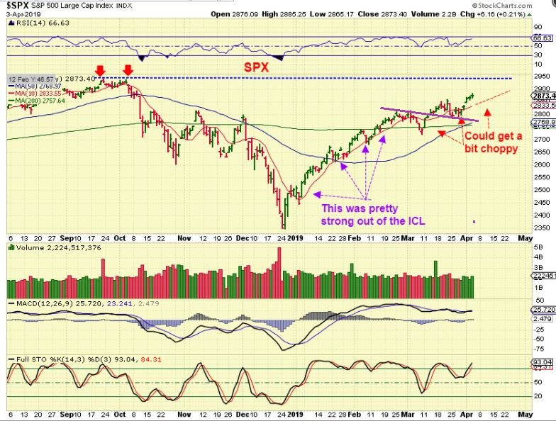 SPX – Do you see the similarity? Purple line is the break out after losing the 200sma. It then got choppy with a retest of that purple line, and moved to new recent highs. MY BLUE LINE shows Sept 2018 highs, and price could be heading there, but it may be choppy.