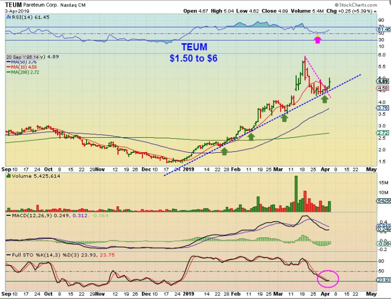 TEUM has been very bullish, and after this recent consolidation, it became oversold. It reversed higher yesterday and is a buy if it doesn’t gap open higher than $5.