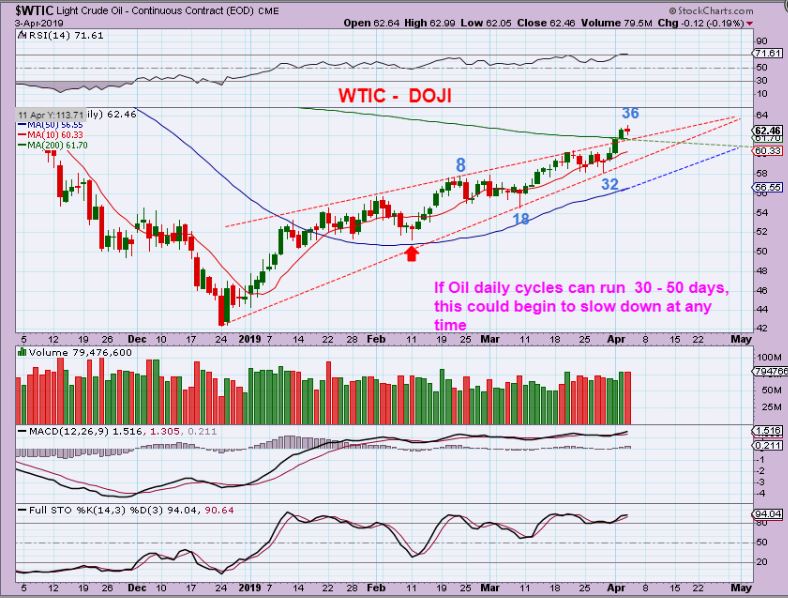 WTIC – Oil has a doji candle after the inventory report, so it could pause here, go sideways, or even begin to dip into a dcl. On day 36, we could be close to a peak, but this would be very right translated and should move higher after a pull back.