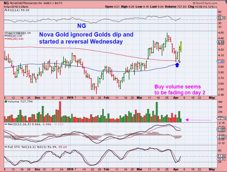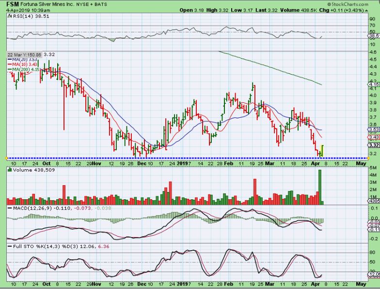FSM– Closing up 7%, FSM is another Silver stock that dropped all the way back to the lows on this sell off & reversed. It can be bought with a stop at the lows.