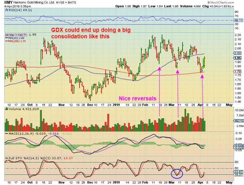 HMY – I’m pointing out HMY to show what long drawn out consolidations can do, and this is what we may be seeing with GDX. Yes, this could break out & rally, but it needs to be said that Just because you get a reversal, it doesn’t always mean a strong rally, it may do something choppy like this, buying time.