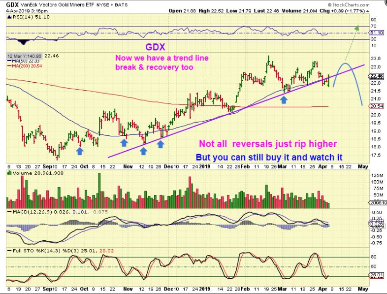 At this point, the reversal is short term bullish, but if the ICL is still ahead, I have to expect that drop in the coming weeks. Look at that chart of GDX right ABOVE again….That has been one choppy run! The choppy sideways move for the past 2 months has made this difficult for both Longs & Shorts. This chart, however, reminds us that all Bull Markets buck around and try to keep the riders off, it can make some people just give up, and off it runs.