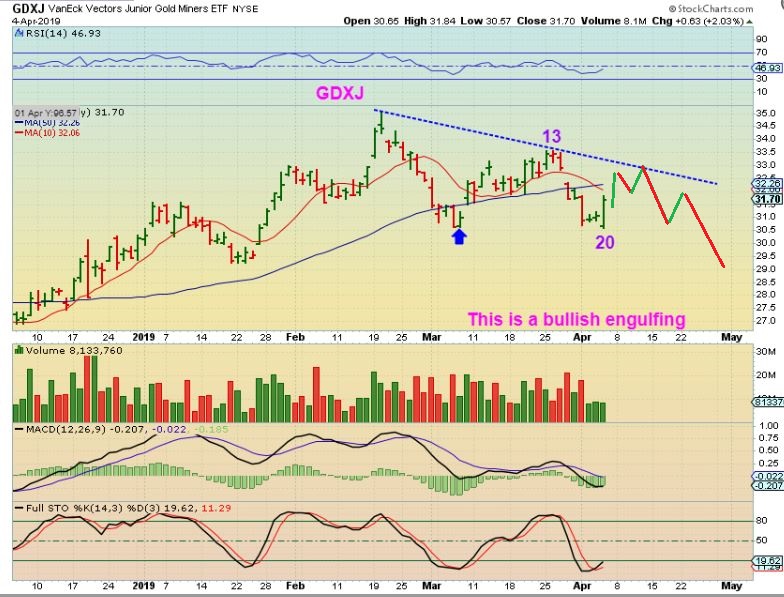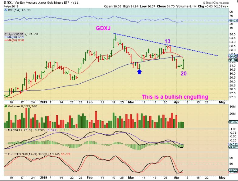 GDXJ – GDXJ has a new low on day 20 & reversal. I have seen dcls on day 20, but they have been rare lately. This reversal is a buy similar to the one in early March, but it ended up being short term gains.