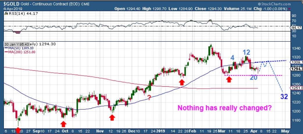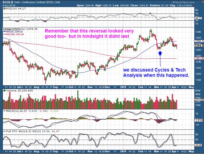 To begin, I want to remind everyone that I discussed the difference between ‘Cycles’ & ‘Technical Analysis’ the last time GOLD broke below the 50 sma and then had a big reversal (blue arrow) in early March. See the chart below. Looking back, nothing changed in the Big Picture except the amount of time that is going by from ICL to ICL, but you may recall that I said back then that a reversal like that was ‘A buy with a stop’ in technical analysis and wait and see how it plays out. A stop must be used and even raised, because Cycles say that an ICL could still be ahead.