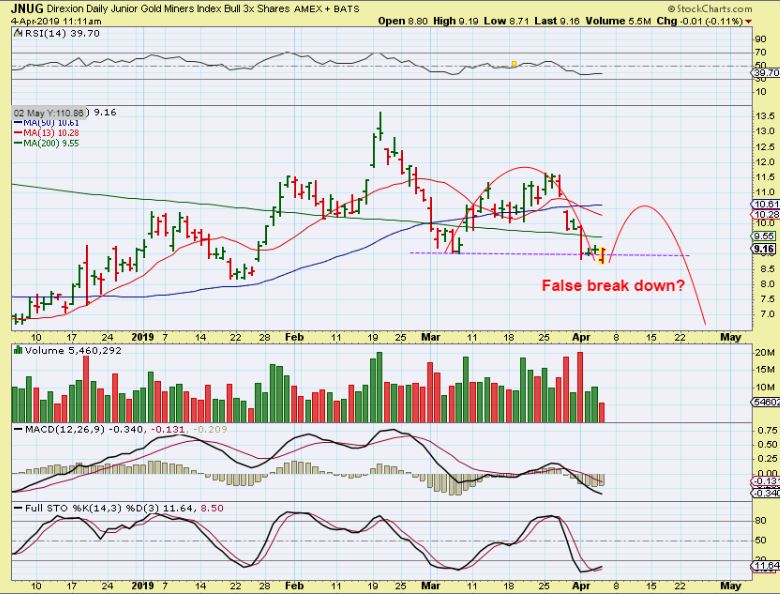 JNUG – For example, JNUG could bounce from $9 to $11 and still roll over. Time will tell.
