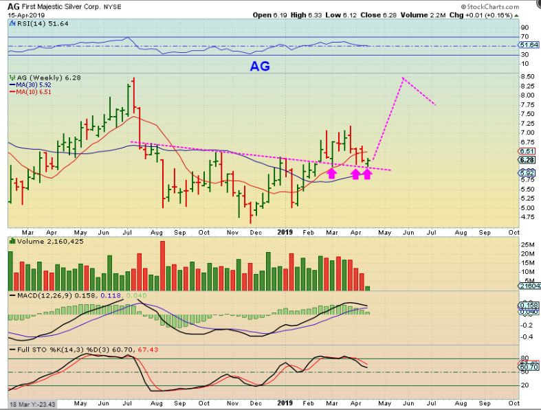 AG WEEKLY – I’m sure that you remember AG on this support area. It held again , so far. Many Silver stocks looked pretty good Mondy , after selling down and reversing into the end of the day.
