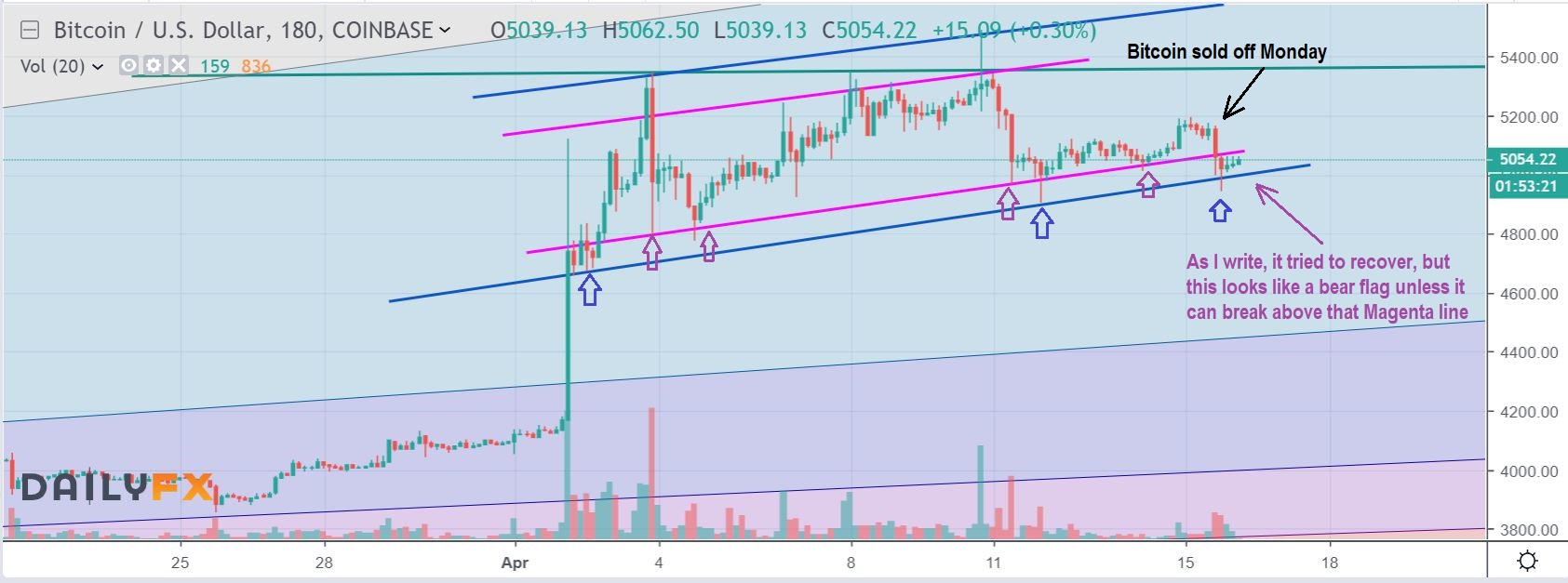 BITCOIN MONDAY NIGHT – After selling off Monday, it tried to recover, but is only forming a bear flag as I write. If this breaks down, Blockchain stocks can drop further. Let me give you examples…