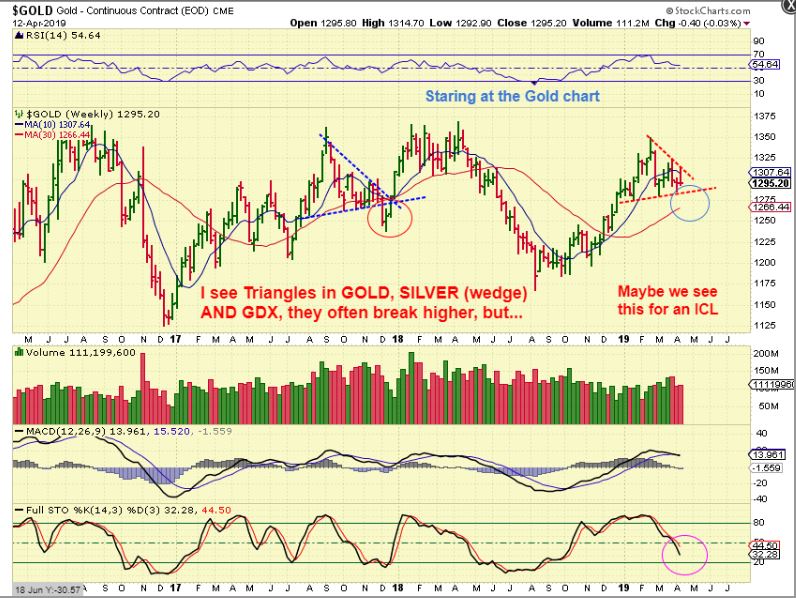 GOLD – I accidentally left this out of the weekend report, but it is an important reminder. I pointed out the idea a while ago that a triangle type formation similar to the one in 2017 might draw in the Bulls, and then suddenly collapse into an ICL. This Stops out the Bulls, and then may run away leaving Bulls behind. Because the stochastics on this weekly chart is not oversold, THIS IS A POSSIBILITY. See the chart similarities.