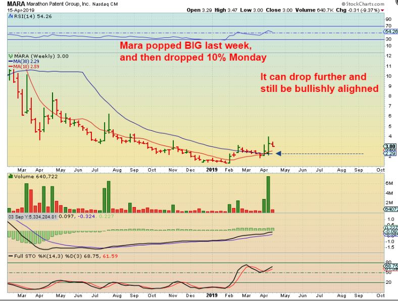 MARA WEEKLY – This is why these Blockchain stocks may not be for everyone. This dropped 9.37%, and could drop a lot more. It popped 50% one day, so a pull back is normal. I bought this much lower and may ride it down, but the long term chart looks fine, and it probably depends on whether or now Bitcoin holds up.