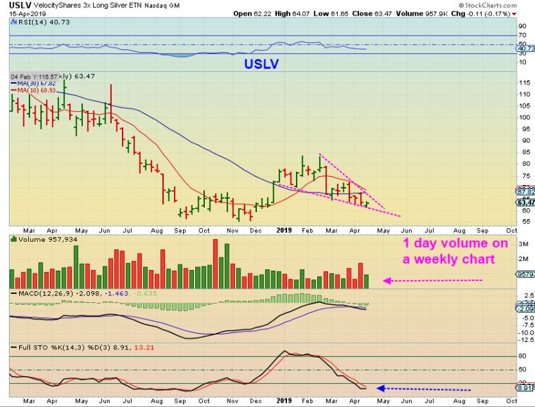 USLV WEEKLY – A reversal in a bullish wedge, and volume is very big for 1 day of a weekly chart. 1 million Volume each day this week could become 5 million by the end of the week. The highest volume on this chart is roughly 3 million. KEEP YOUR EYES ON SILVER, Silver looks Bullish in many ways.