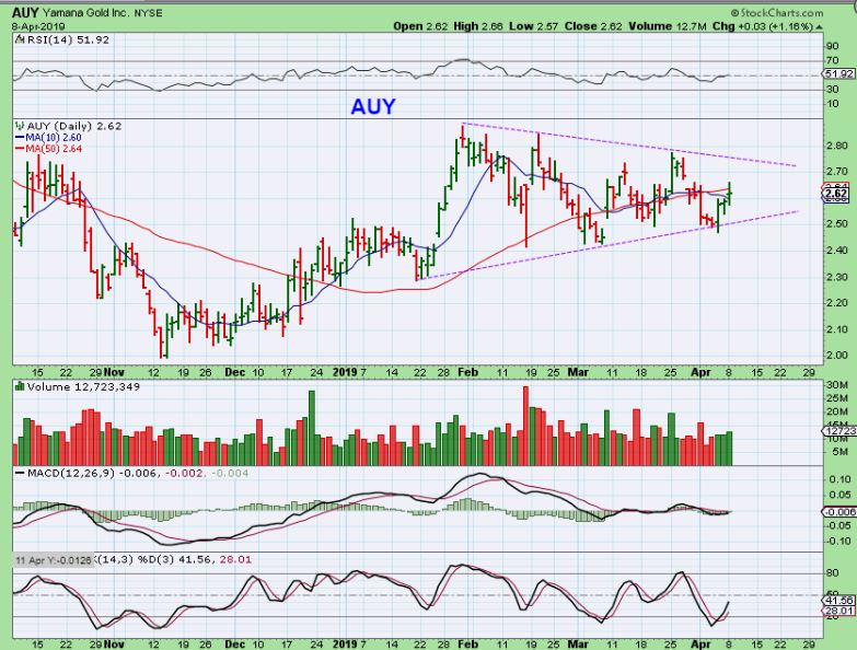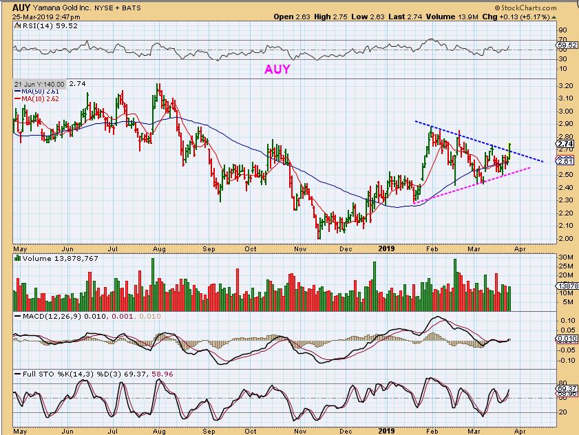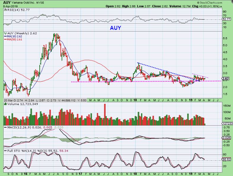 AUY   – By the end of March this chart showed a triangle formed in all of that choppiness that we have seen with miners.  It looked to be breaking out, I called that a buy, however…