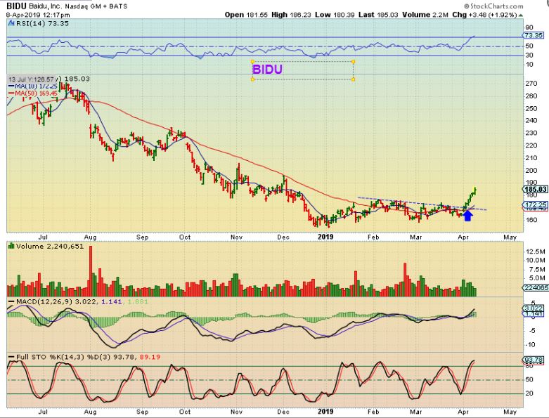 BIDU  –  Now it is running away each day since I posted that chart.  Buy the dip if we get one.