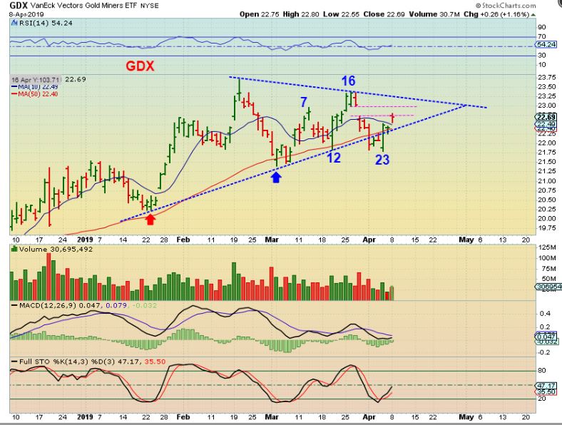 GDX   – We have a similar set up in GDX.  As you can see on this chart,  GDX has actually been chopping sideways at this level since January.  I would have expected it to roll over and drop into a more pronounced ICL type drop, but now I am watching to see if day 23 lows hold up or is broken.  It seems more likely that we have another drop ahead, maybe after a gap fill & tag of the upper blue line?