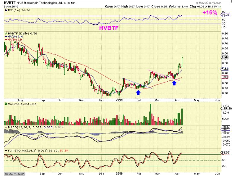 HVBTF –  HVBTF was up  another 16% Monday after breaking from this bull flag.  I have been pushing this one as a buy lately and in the past.  I have owned it for a while since it continues to act bullishly.  This one can be hard to ride, since it goes sideways for weeks, but if Bitcoin gets running, This can also start a steeper incline  ( Like EDXC has for example).