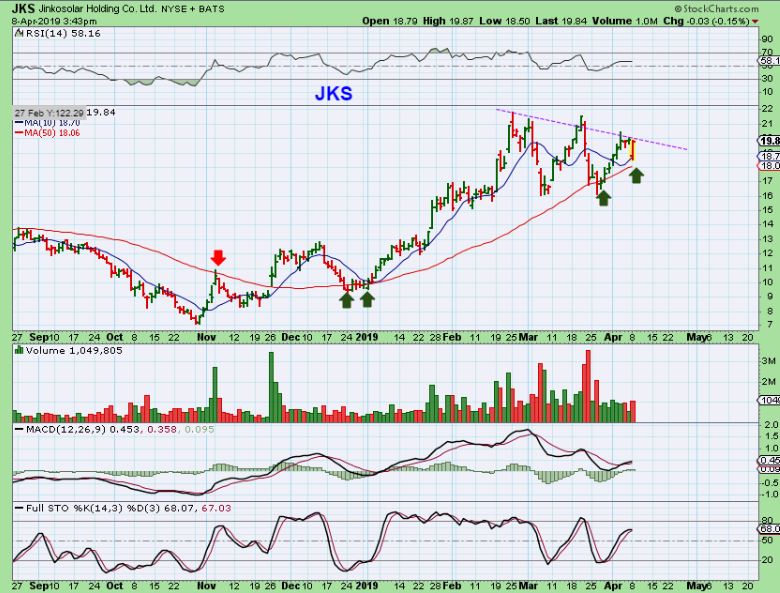 JKS –  JKS is another solar stock that may be ready to go higher too.  It dropped to the 50sma and reversed higher yesterday.
