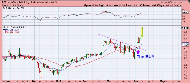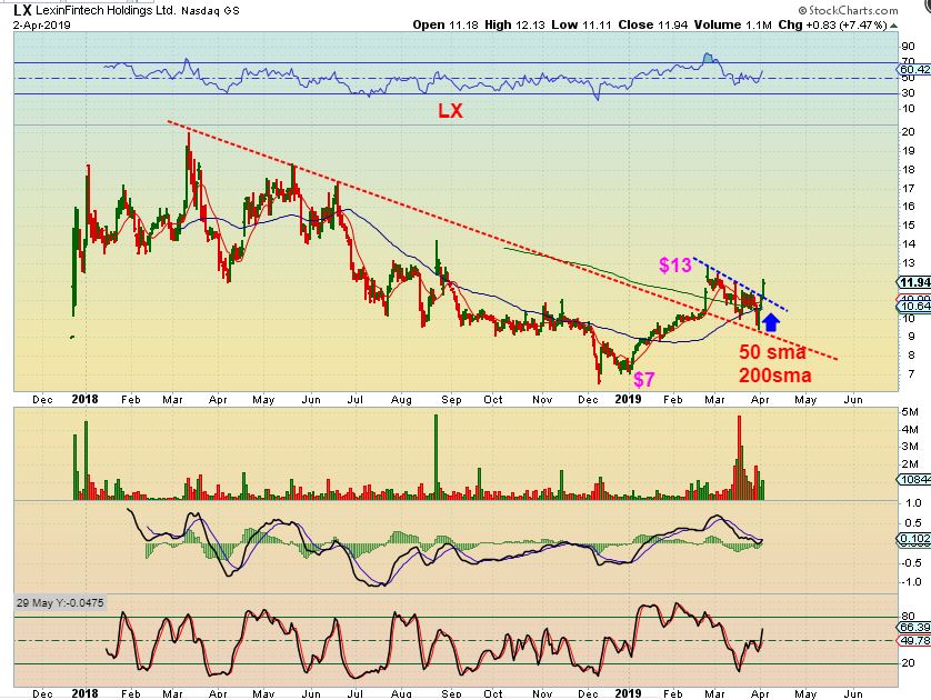 LX  APRIL 3rd –   After a run from $7 to $13, I pointed out the bullish set up on LX here.   It actually could have been bought before the break out at the 50sma  ( $10) or as it breaks out. Notice price pushing on that blue down trend line.