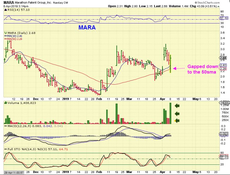 MARA  – I have been trading blockchains stocks as Bitcoin rises from the base.  Yesterday I saw MARA drop below the 50sma and I thought that it looked ugly by midday.  As the day moved on, it reversed above the 50sma and put in a very high volume reversal, so I posted this in the comments.   It actually closed up 10% with big volume.   You can buy it here, since it runs like a gazelle, but it obviously has very large swings  ( I own it) .
