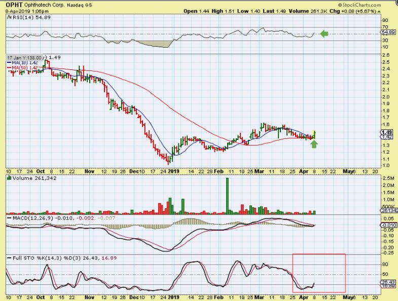 OPHT – I like this oversold set up as price reverses off of the crawl along the 50sma.  You can buy it with a tight stop, and I can see this moving over $2 once it gets going.  Resistance to the left is minimal up to about $2.30. NOTE:  Biotech stocks have a bit of added risk if they fail a trial or FDA doesn’t approve their product, but many are breaking & running bullishly lately.   We’ve traded ZIOP, TENX, TWST, GH, LJPC,  MACK, LPTX, etc etc with good results.  I also bought SELB last week and it pushed higher into the close yesterday (  up 11% at one point)