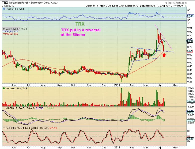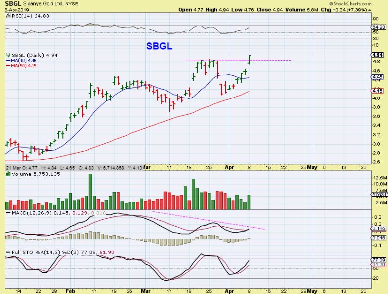 So for the Miners , it seems more likely that we have another drop ahead, but individual Miners have been doing their own thing. I mentioned in the comments yesterday that SBGL had actually made new 1 year highs midday, and  TRX is also at 1 year highs.  On the other hand, last week we saw reversals at the lows for CDE & FSM.  They made a  Double bottom low,  so those could actually be bought with stops too.  I will post charts of TRX & SGBL below, along with a few other ideas.