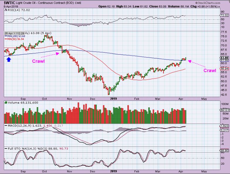 WTIC  – Oil has crawled along the TOP of the 200 sma and remains bullish.