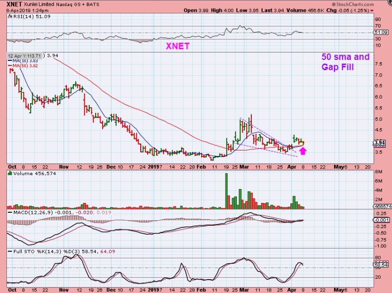XNET  –  I own XNET,  but it didn’t break higher like many other blockchain stocks. It actually dropped yesterday to the 50sma and finished filling a gap. I added JUST IN CASE it wants to break & run higher with the others this week.