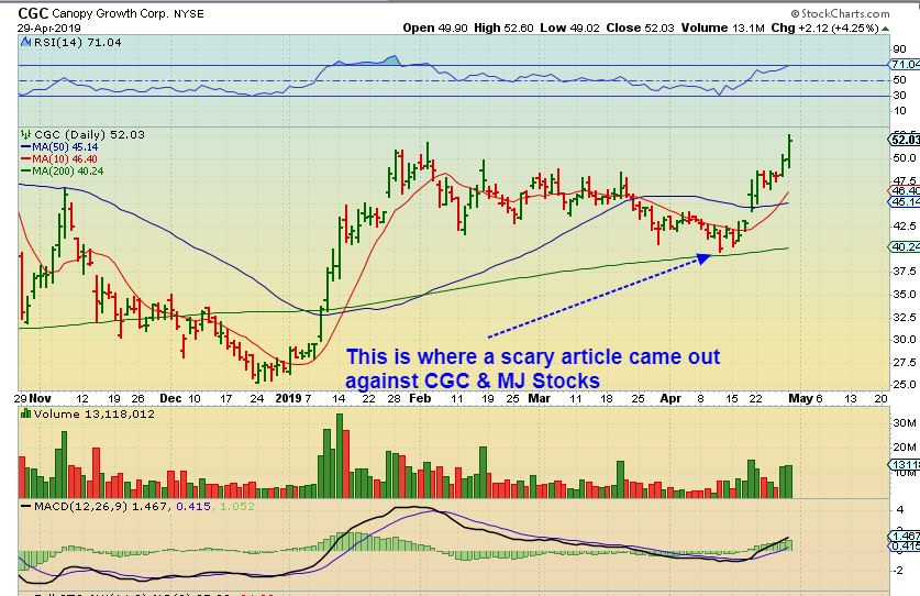 CGC APRIL 11 – Someone writes a bearish article on CGC when it looks to me like it is at the channel lows, oversold and a normal pull back in a channel. He warned to stay away from MJ stocks, they would now struggle. I was looking to buy HEXO then, ACB, and CGC. This was actually very bullish looking when an uptrending stock drops to the 200sma and reverses. I mentioned that someone could buy a reversal if we get one, and…