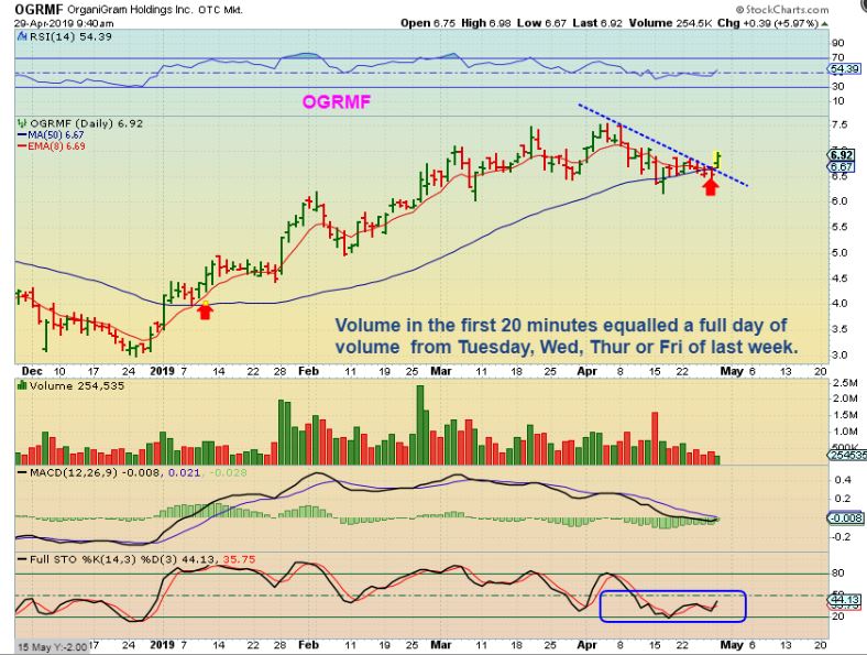 OGRMF – It closed up 11% at the highs and has very big volume. THIS LOOKS LIKE HEXO ALL OVER AGAIN. If you bought this with me, it is worth holding on. I think that it is still a buy, though it could do a day or two drop and then run higher. Again, look at HEXO as an example of what we could see here.