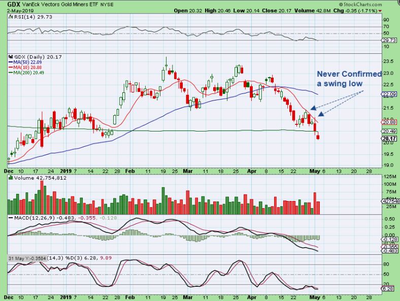 GDX – Notice that GDX did not break above the 10sma yet anyway, so it did not confirm a dcl. That means that this may be an extended daily cycle, this would be day 42. Thursday it dropped below the Fed Wed lows and closed under the 200sma. May I just say that We have to View this as bearish for now until further action. This happened in January, and it resolved upside, but for now it is a bearish signal, and I got stopped out of my leverage.