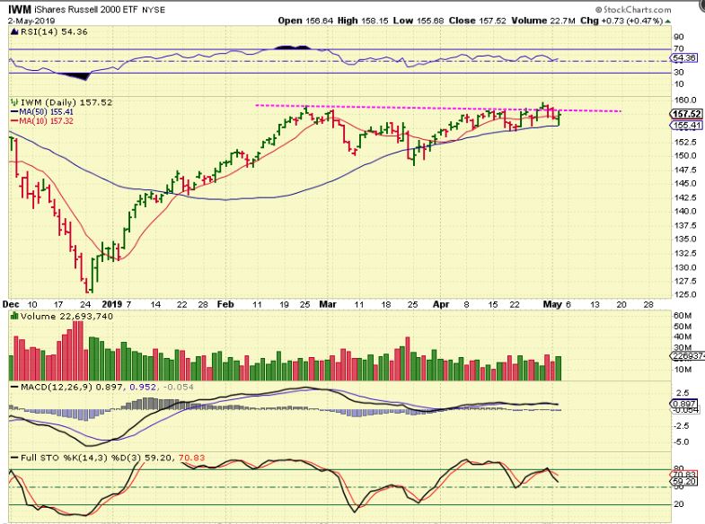 QQQ – I could see a drop lower in the QQQ. Volume increased, the MACD crossed, and there is plenty of overbought indications. The last DCL tagged the 34 sma. Let’s see what Friday does after this Doji on Thursday. This dip does not look like enough of a dip for a dcl, but the markets have been strong and many Bulls are riding this and buying the dips.